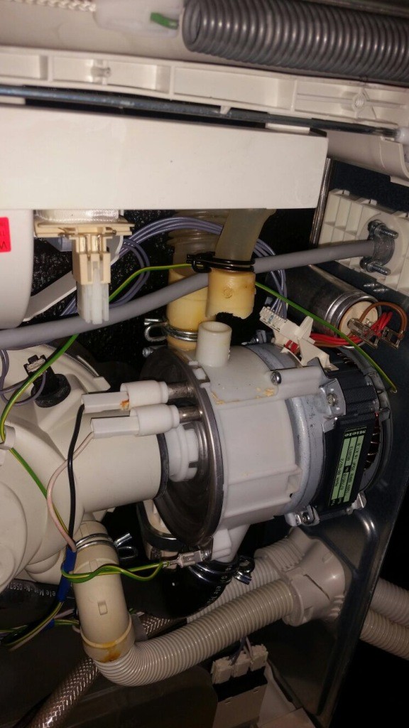 Dishwasher side panel off revealing sump, circulation pump and heat exchanger
