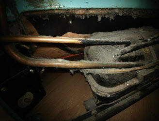 Close up of mechanical defrost timer motor and dusty wiring harness during refrigerator repair